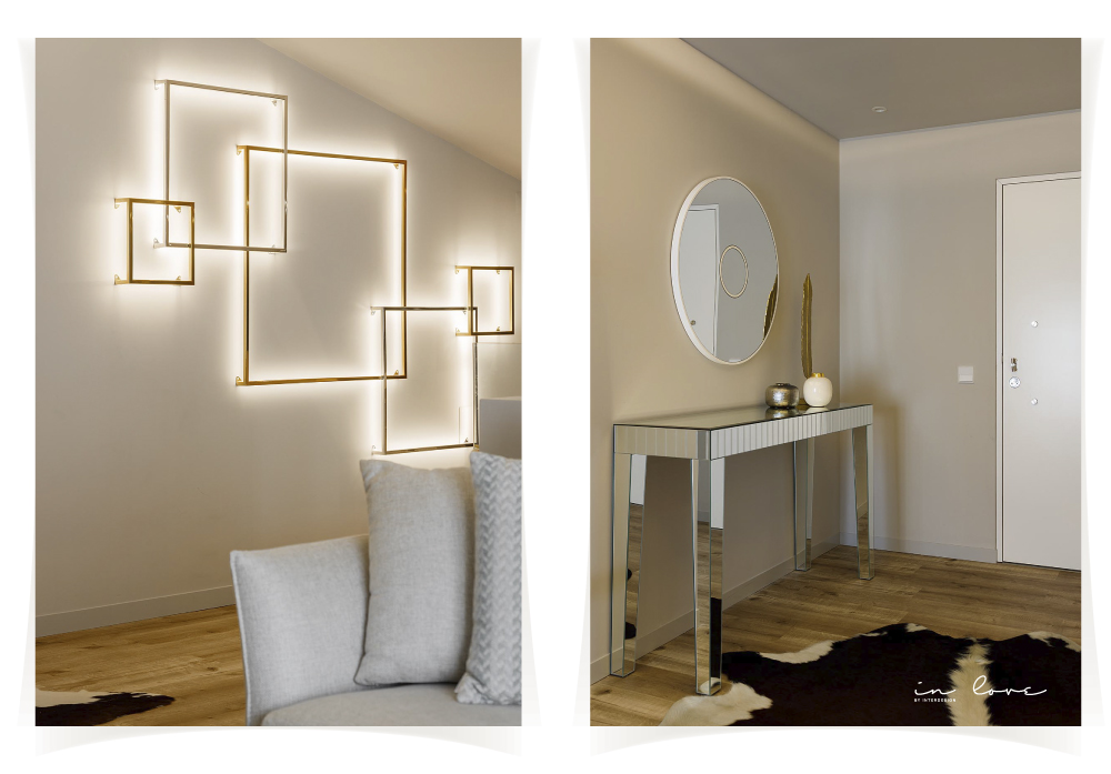 Ao entrarmos em casa somos recebidos num hall elegante e ao mesmo tempo impactante, que combina um jogo entre luzes e os espelhos. O nosso olhar recai para o tapete escolhido, que se torna uma peça statment e preenche o espaço para o tornar mais quente.