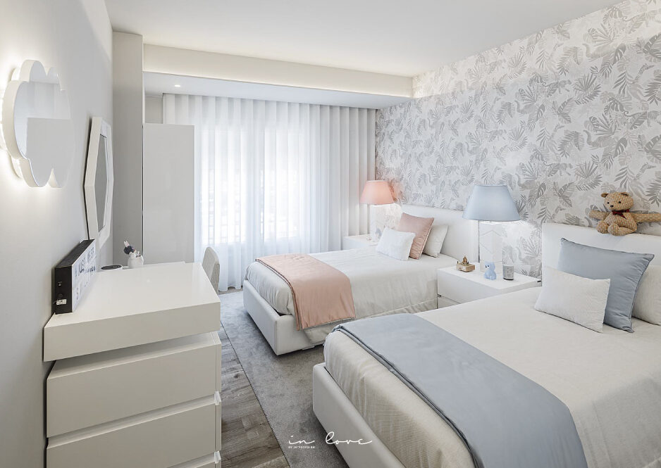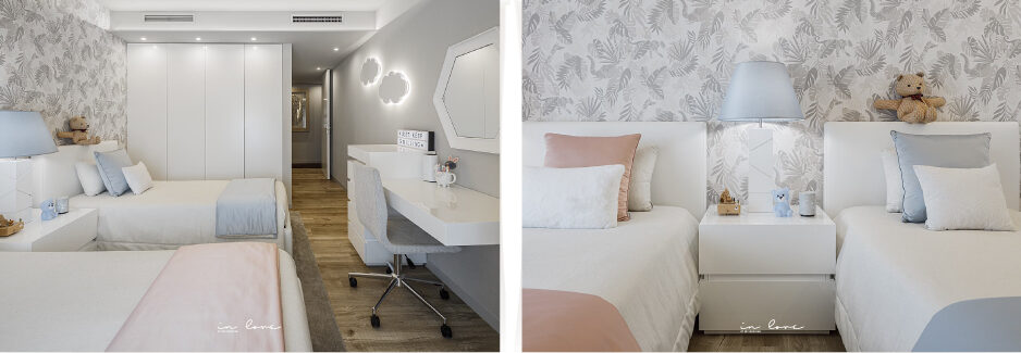 A nossa preocupação foi tornar o quarto versátil e adaptado aos dois. Para unificar o espaço, a aposta foi em tons neutros como branco e beje, nomeadamente no papel de parede com animais, transversal a todo os gostos. Para dar individualidade ao espaço, foram colocados elemetos azuis e cor de rosa para identificar as zonas de cada criança, numa harmonia perfeita.