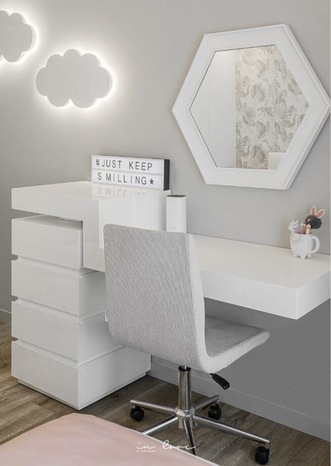 O destaque vai para as nuvens aplicadas na parede, que servem como ponto de luz para o bebé da família e o toucador athum, ótimo para brincar/estudar.